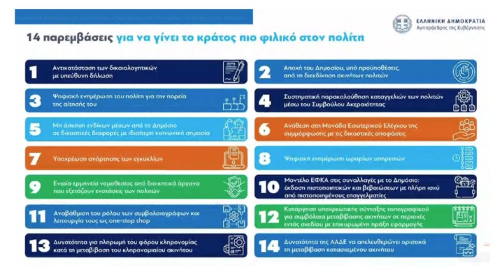 Ο αντιπρόεδρος υπογράμμισε ότι το νομοσχέδιο περιλαμβάνει 14 παρεμβάσεις διοικητικού χαρακτήρα, οι οποίες θα φέρουν αλλαγές με βάση κοινή λογική, αντιμετωπίζοντας διαδικασίες που έως σήμερα δημιουργούν καθημερινή «τρέλα» στους πολίτες.