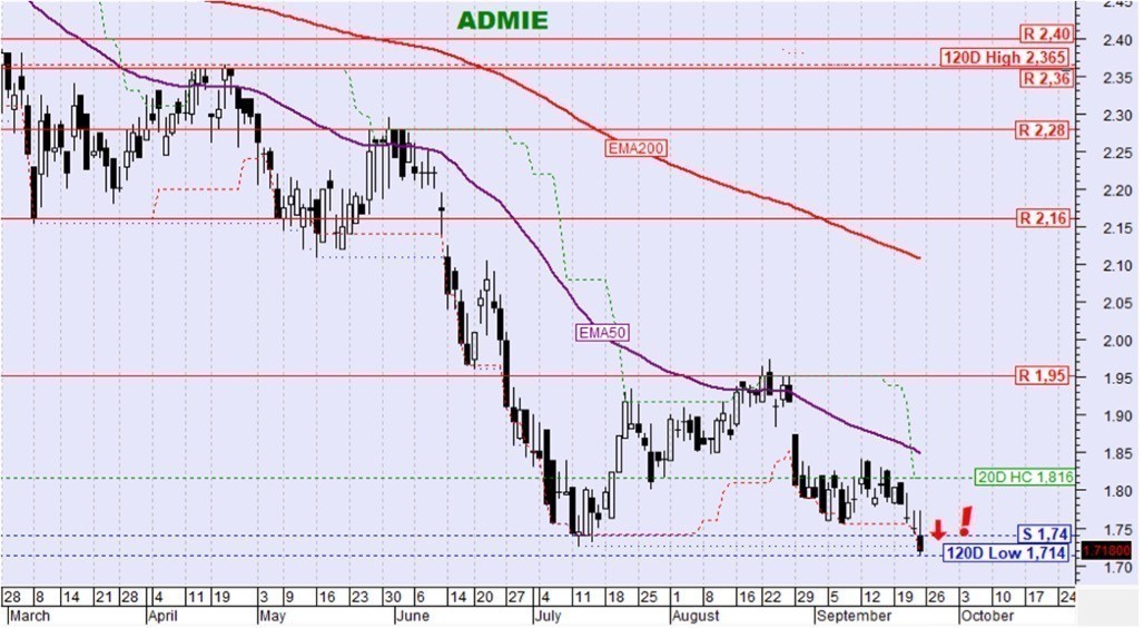 Η μετοχή αναζήτησε στήριξη λίγο πάνω από τα 1,74€ την οποία φαίνεται να βρήκε προσωρινά αφού στη συνέχεια κινήθηκε έντονα καθοδικά με αποτέλεσμα στην τελευταία συνεδρίαση της εβδομάδας να διασπαστεί η στήριξη στα 1,74€ και να σημειωθεί νέο χαμηλό 120 ημερών (1,714€) χωρίς να υπάρχει κάποια ένδειξη για αλλαγή της γενικής τεχνικής εικόνας.