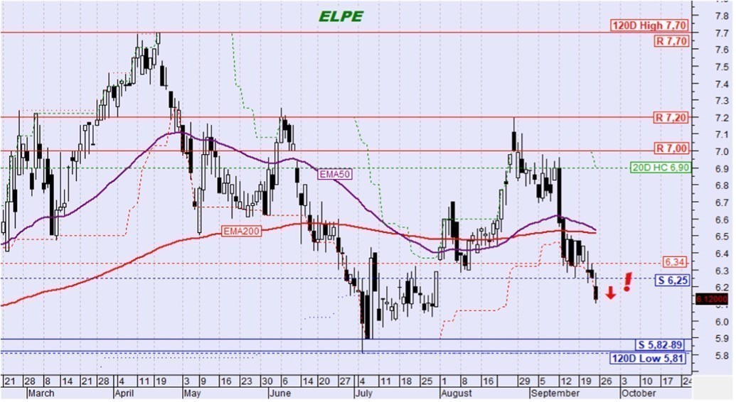 Η μετοχή υπό την πίεση της αντίστασης στα 6,90€ που δεν κατάφερε να υπερβεί, διόρθωσε έντονα διέσπασε τον ΕΜΑ50 και τον ΕΜΑ200. Όπως ήταν αναμενόμενο η αναζήτηση στήριξης μεταφέρθηκε στη διπλή στήριξη στα 6,25€-6,34€ που ενώ αρχικά ανταποκρίθηκε με επιτυχία ανακόπτοντας την καθοδική πορεία της μετοχής την περασμένη εβδομάδα διασπάστηκε καθοδικά οπότε πλέον αναμένεται η κίνηση μέχρι την επόμενη περιοχή στήριξης στα 5,82€-5,89€.