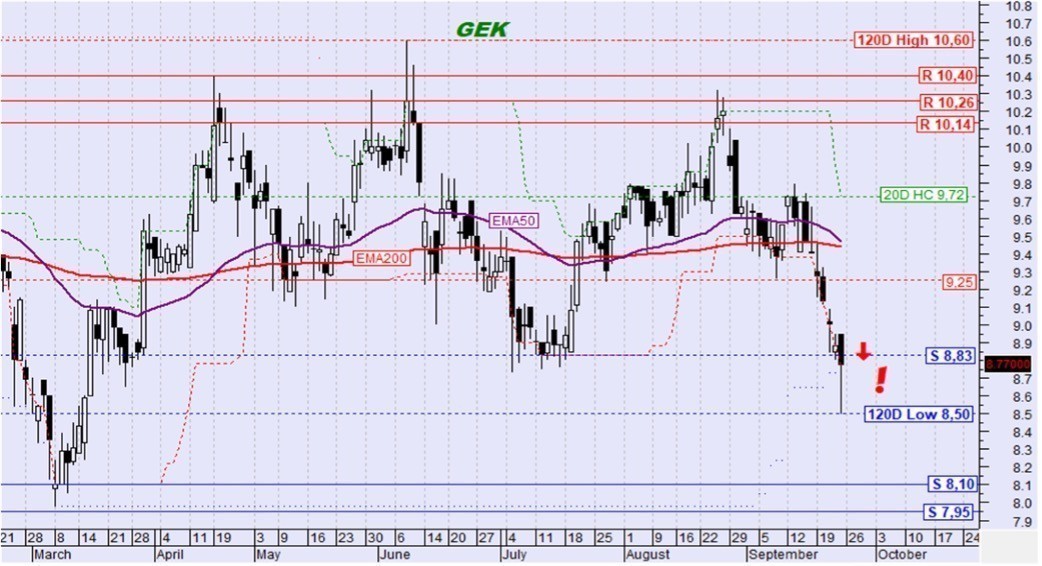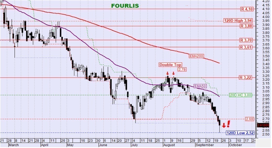 Η μετοχή μετά την απώλεια του ΕΜΑ50 ενεργοποίησε ένα καθοδικό σχηματισμό διπλής κορυφής που είχε στόχο στα 2,78€ ο οποίος έχει ήδη επιτευχθεί. Η μετοχή συνέχισε καθοδικά και πέτυχε νέο χαμηλό των 120 ημερών (2,52€). Σε αναζήτηση στήριξης βρίσκεται η μετοχή.