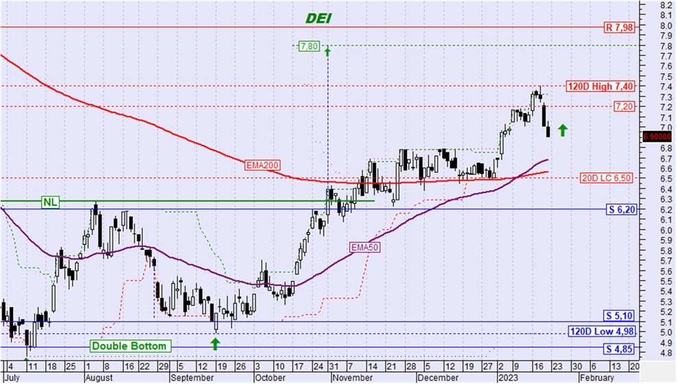 Η μετοχή διατηρεί την μεσοπρόθεσμη ανοδική τάση. Παραμένει ενεργός ο ανοδικός σχηματισμός διπλού πυθμένα όπως και ο ανοδικός στόχος στα 7,80€. Την περασμένη εβδομάδα κατάφερε να πετύχει νέο υψηλό 120 ημερών στα 7,40€ από όπου ξεκίνησε μια διορθωτική κίνηση τεχνικού χαρακτήρα προς το παρόν αφού δεν έχει απειλήσει την διάσπαση του ΕΜΑ50.