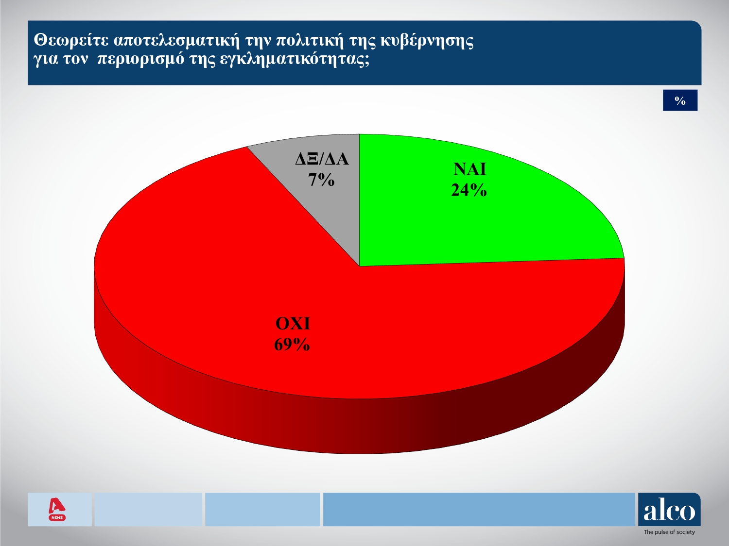 Παράλληλα, το 69% εκτιμά ότι δεν είναι αποτελεσματική πολιτική της κυβέρνησης στον περιορισμό της εγκληματικότητας.