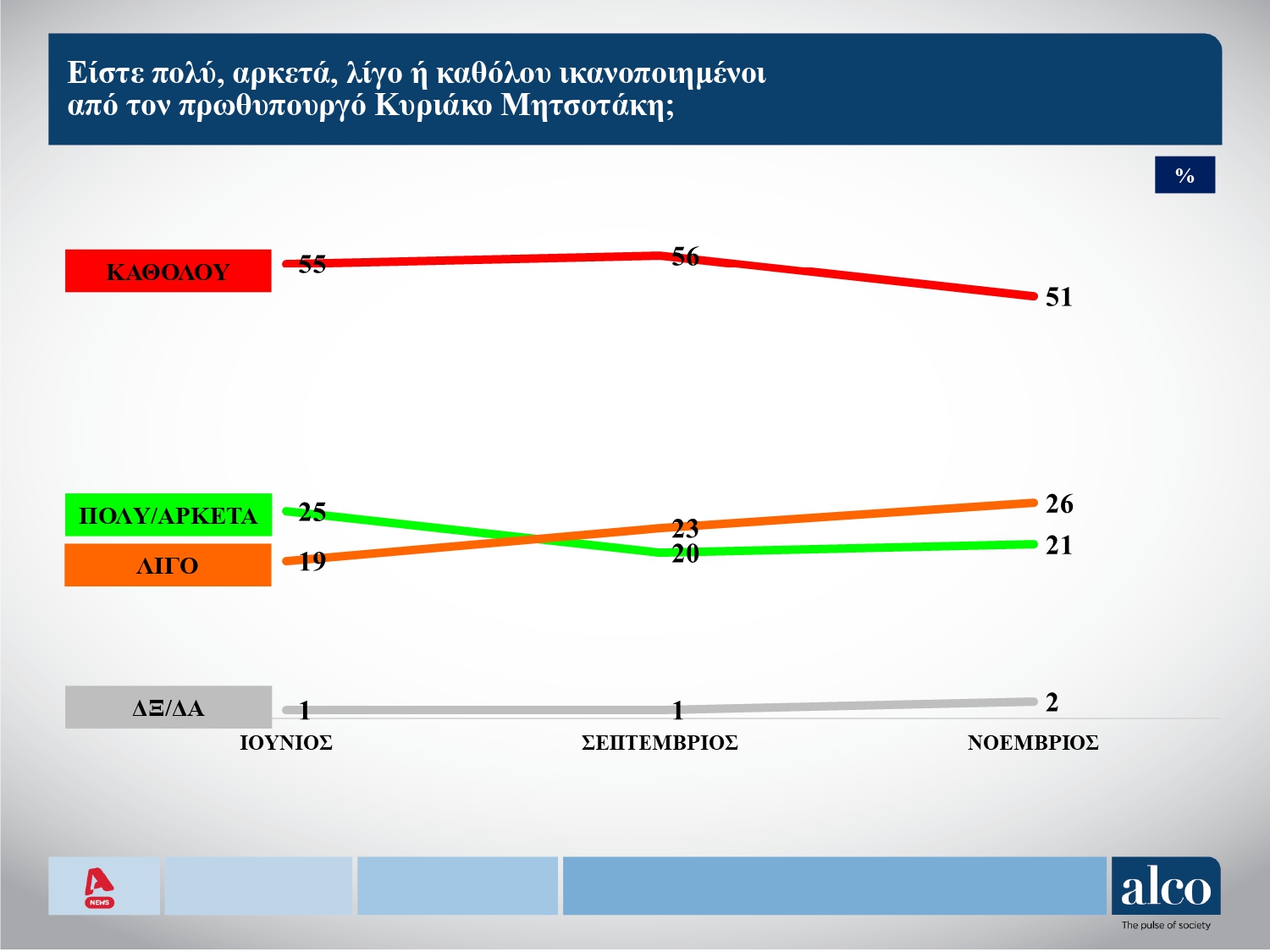 Μειώνονται ελαφρώς οι αρνητικές γνώμες για το έργο κυβέρνησης και πρωθυπουργού, το καθόλου ικανοποιημένοι υποχωρεί από 53% το Σεπτέμβριο σε 48% τον Νοέμβριο.