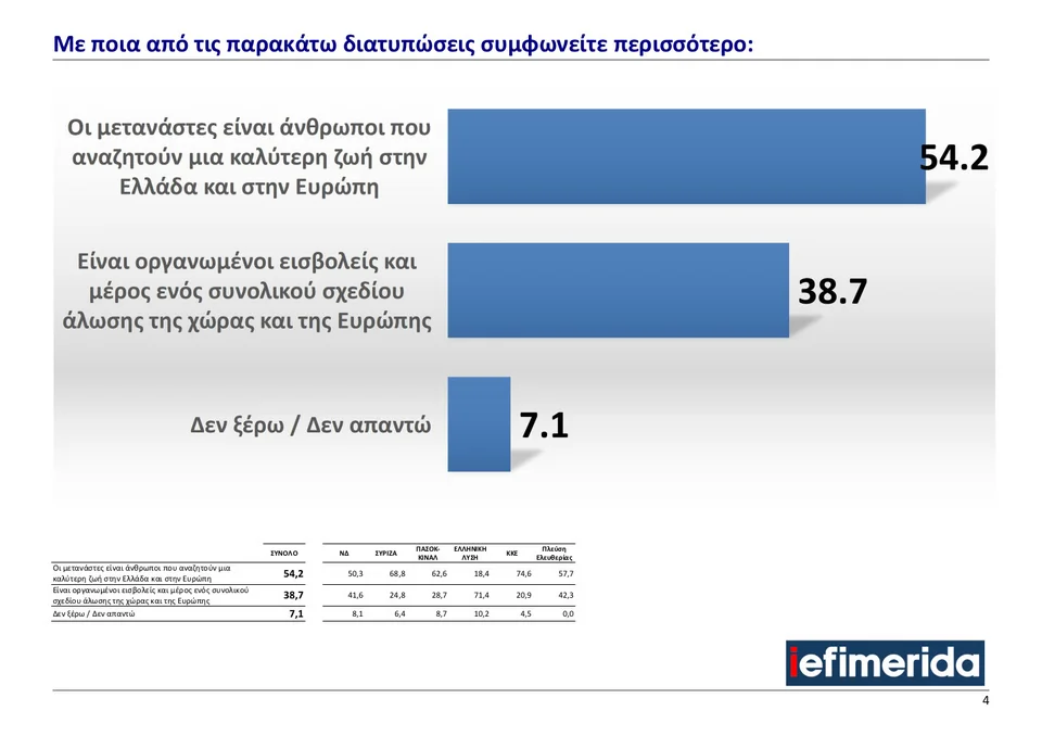 Σημαντικό είναι επίσης ότι το 38,7% των ερωτηθέντων τάσσεται υπέρ της άποψης ότι οι μετανάστες είναι οργανωμένοι εισβολείς και μέρος ενός ευρύτερου σχεδίου για την αλλοίωση της χώρας και της Ευρώπης.