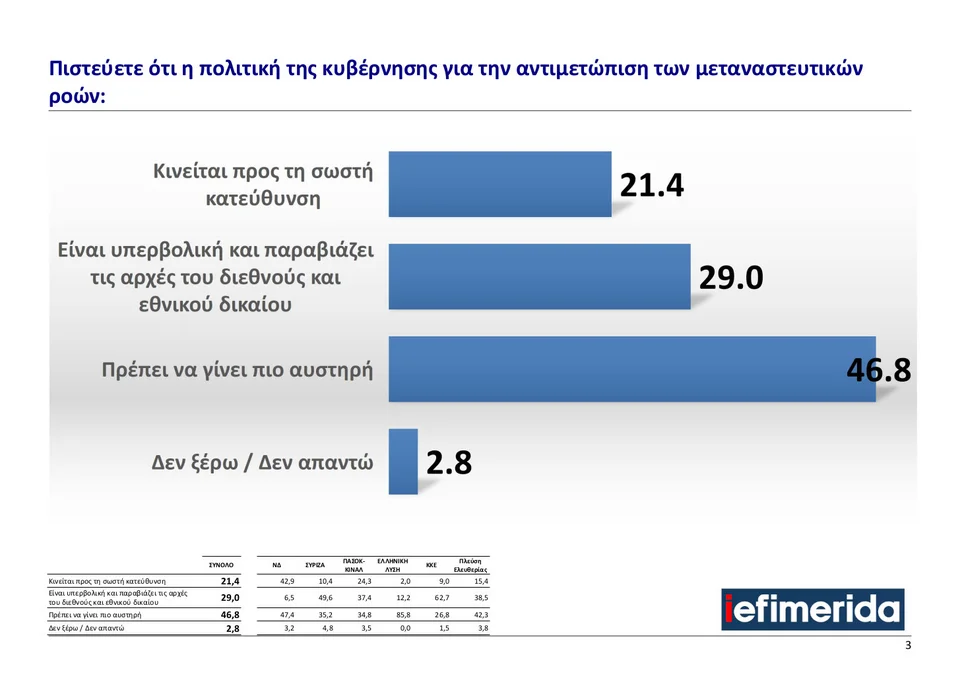 Σύμφωνα με την πρόσφατη έρευνα της GPO για το iefimerida, το 21,4% των πολιτών θεωρεί ότι η κυβερνητική πολιτική για τις μεταναστευτικές ροές κινείται σωστά, ενώ το 29% την κρίνει υπερβολική και παραβιάζουσα το διεθνές και εθνικό δίκαιο. Ωστόσο, η πλειοψηφία, με 46,8%, ζητά αυστηροποίηση του μεταναστευτικού πλαισίου.