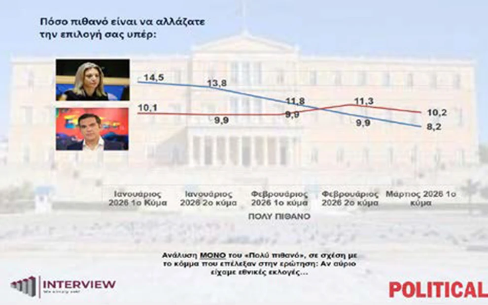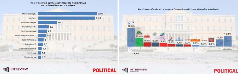 Opinion Poll: Άνοδος 2,5 μονάδων στην εκτίμηση ψήφου για τη ΝΔ, στο 32,7% – Πτώση στη δυνητική ψήφο για Τσίπρα και Καρυστιανού