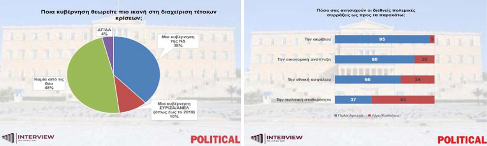 Σύμφωνα με δημοσκόπηση της Interview για την εφημερίδα «Political», οι πολίτες εμφανίζονται ιδιαίτερα ανήσυχοι για τις οικονομικές συνέπειες της κρίσης στη Μέση Ανατολή. Ο μεγαλύτερος φόβος αφορά την ακρίβεια και τις πιθανές επιπτώσεις στην οικονομική ανάπτυξη της χώρας, ενώ η ανησυχία για ζητήματα ασφάλειας και πολιτικής σταθερότητας καταγράφεται σε χαμηλότερα επίπεδα.