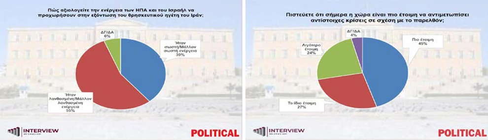 Σε ερώτηση σχετικά με την επιχείρηση των ΗΠΑ και του Ισραήλ που οδήγησε στην εξόντωση του θρησκευτικού ηγέτη του Ιράν, το 55% των ερωτηθέντων τη χαρακτηρίζει λανθασμένη ή μάλλον λανθασμένη. Από τις απαντήσεις προκύπτει ότι η στάση αυτή δεν συνδέεται με στήριξη στο θεοκρατικό καθεστώς της Τεχεράνης, αλλά κυρίως με τον φόβο για τις οικονομικές επιπτώσεις και την πιθανή επιβράδυνση της αναπτυξιακής πορείας της χώρας. Αντίθετα, το 39% θεωρεί την ενέργεια σωστή ή μάλλον σωστή, ενώ το 6% δηλώνει ότι δεν έχει άποψη.