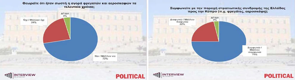 Ανάλογη εικόνα καταγράφεται και σε σχέση με τα εξοπλιστικά προγράμματα των τελευταίων ετών. Το 72% δηλώνει θετικό στην αγορά φρεγατών και μαχητικών αεροσκαφών, ενώ το 24% εκφράζει αρνητική άποψη και το 4% δεν απαντά.