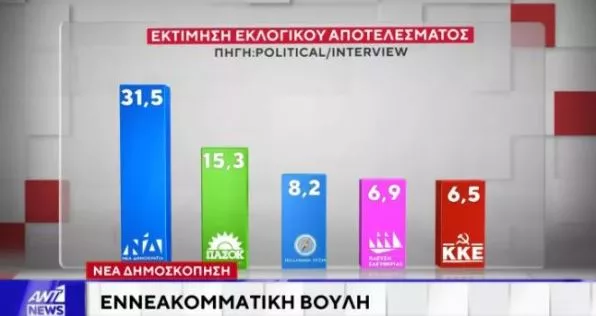 Στην εκτίμηση ψήφου, η Νέα Δημοκρατία συγκεντρώνει 31,5%, ενώ το ΠΑΣΟΚ ακολουθεί με 15,3%.