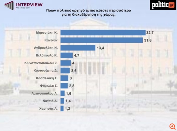 Στην ερώτηση για τον πολιτικό αρχηγό που εμπιστεύονται περισσότερο οι πολίτες για τη διακυβέρνηση της χώρας, ο Κυριάκος Μητσοτάκης καταγράφει προβάδισμα με 32,7%, διατηρώντας σαφή απόσταση από τους υπόλοιπους πολιτικούς αρχηγούς.
