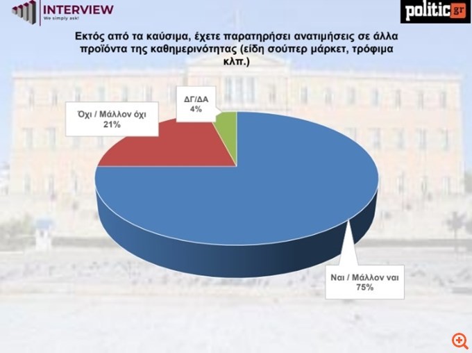Ο πόλεμος φαίνεται να έχει περάσει πλέον στην καθημερινότητα των Ελλήνων, καθώς το 65% δηλώνει ότι έχει επηρεαστεί, έναντι του 34% που απαντά αρνητικά. Μάλιστα το 75% δηλώνει πως έχει παρατηρήσει ανατιμήσεις σε προϊόντα καθημερινής κατανάλωσης, όπως τρόφιμα και είδη σούπερ μάρκετ, έναντι του 21% που απαντά αρνητικά.