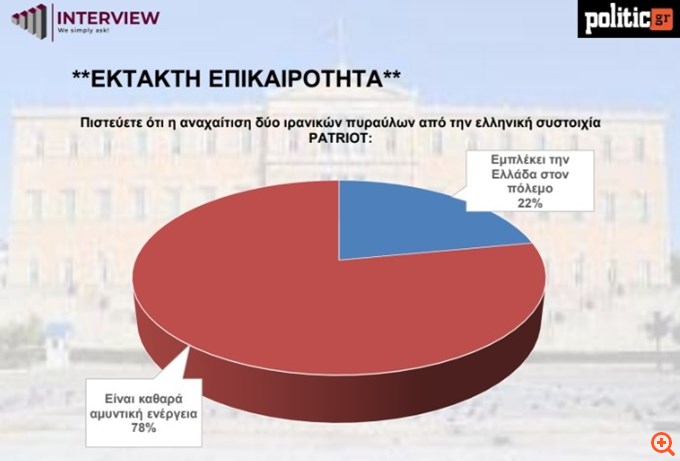 Ξεκάθαρη εμφανίζεται η στάση των Ελλήνων στο ζήτημα της αναχαίτισης των ιρανικών πυραύλων από την ελληνική συστοιχία Patriot, με το 78% να τη θεωρεί καθαρά αμυντική ενέργεια. Αντίθετα, το 22% θεωρεί ότι η ενέργεια αυτή εμπλέκει τη χώρα στον πόλεμο.