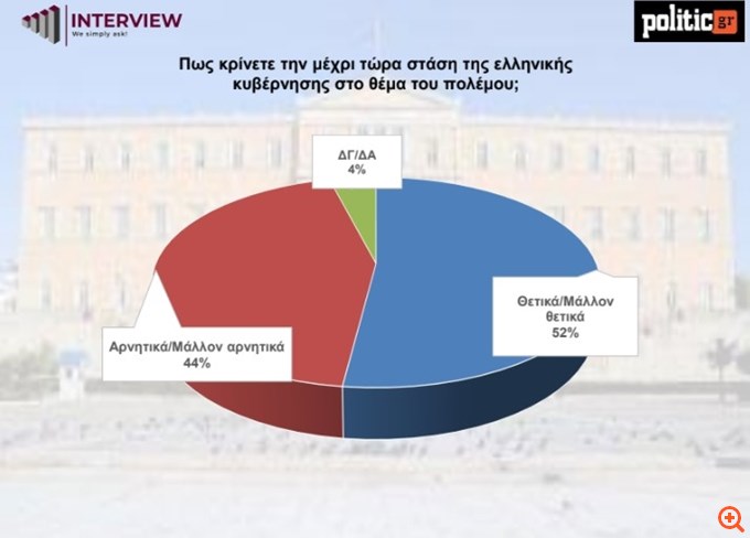 Την ίδια ώρα, το 52% των πολιτών αξιολογεί θετικά τη στάση της κυβέρνησης στο θέμα του πολέμου (“θετικά” ή “μάλλον θετικά”), έναντι του 44% που την αξιολογεί αρνητικά.