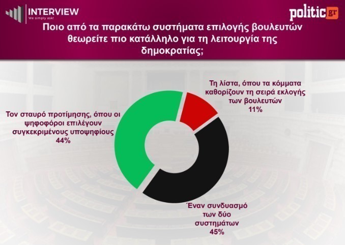 Η συζήτηση για αλλαγές στο εκλογικό σύστημα αναδεικνύει προτίμηση σε μικτά μοντέλα: το 45% τάσσεται υπέρ συνδυασμού σταυρού προτίμησης και λίστας, ενώ το 44% επιλέγει αποκλειστικά τον σταυρό. Αντίθετα, η καθαρή λίστα συγκεντρώνει μόλις 11%.