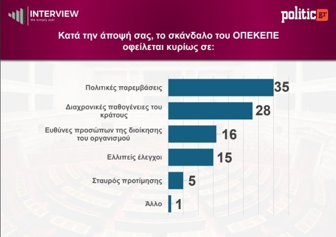 Σε ό,τι αφορά το ζήτημα του ΟΠΕΚΕΠΕ, το 35% αποδίδει την ευθύνη σε πολιτικές παρεμβάσεις, ενώ το 28% το συνδέει με διαχρονικές δυσλειτουργίες του κράτους. Παράλληλα, το 16% επιρρίπτει ευθύνες στη διοίκηση του οργανισμού και το 15% σε ελλιπείς ελεγκτικούς μηχανισμούς.