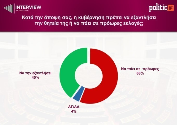 Ισχυρή είναι η τάση υπέρ των πρόωρων εκλογών, καθώς το 56% των ερωτηθέντων τάσσεται υπέρ της προσφυγής στις κάλπες, έναντι 40% που επιθυμεί την ολοκλήρωση της κυβερνητικής θητείας. Το εύρημα καταδεικνύει ενίσχυση της συγκεκριμένης επιλογής σε σχέση με προηγούμενες μετρήσεις.