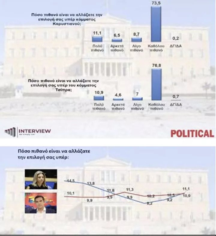 Σύμφωνα με τη δημοσκόπηση της Interview, στην ερώτηση «πόσο πιθανό είναι να αλλάζατε την επιλογή σας υπέρ κόμματος Καρυστιανού;», το 11,1% απαντά πολύ πιθανό, το 6,5% αρκετά πιθανό, το 8,7% λίγο πιθανό, το 73,5% καθόλου πιθανό και το 0,2% ΔΓ/ΔΑ.