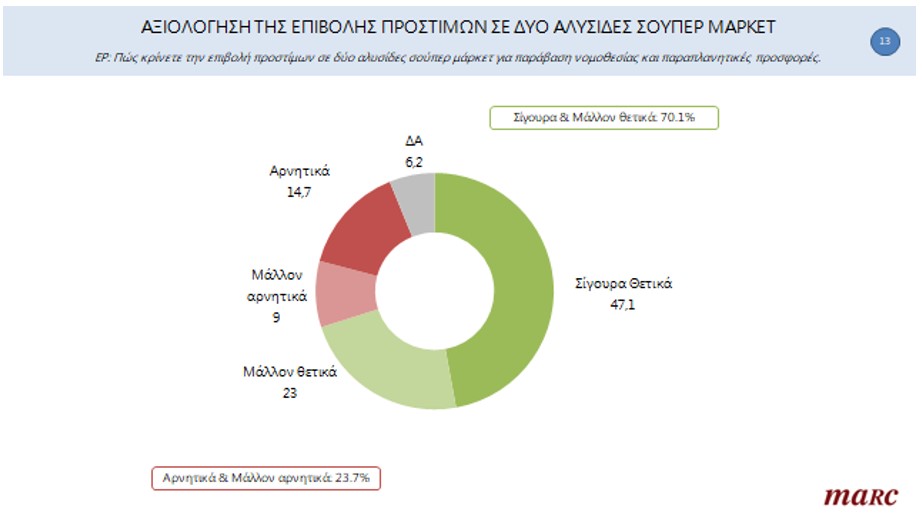 Συγκεκριμένα, οι ερωτηθέντες δηλώνουν σύμφωνοι με τα πρόστιμα που επέβαλε η ΔΙΜΕΑ σε δύο σούπερ μάρκετ για παραβίαση του πλαφόν κέρδους -όπως ίσχυε μέχρι τον περασμένο Ιούνιο- και του κώδικα δεοντολογίας που έχει τεθεί σε ισχύ από την άνοιξη, σύμφωνα με δημοσκόπηση της εταιρείας Marc για την εφημερίδα Real News.