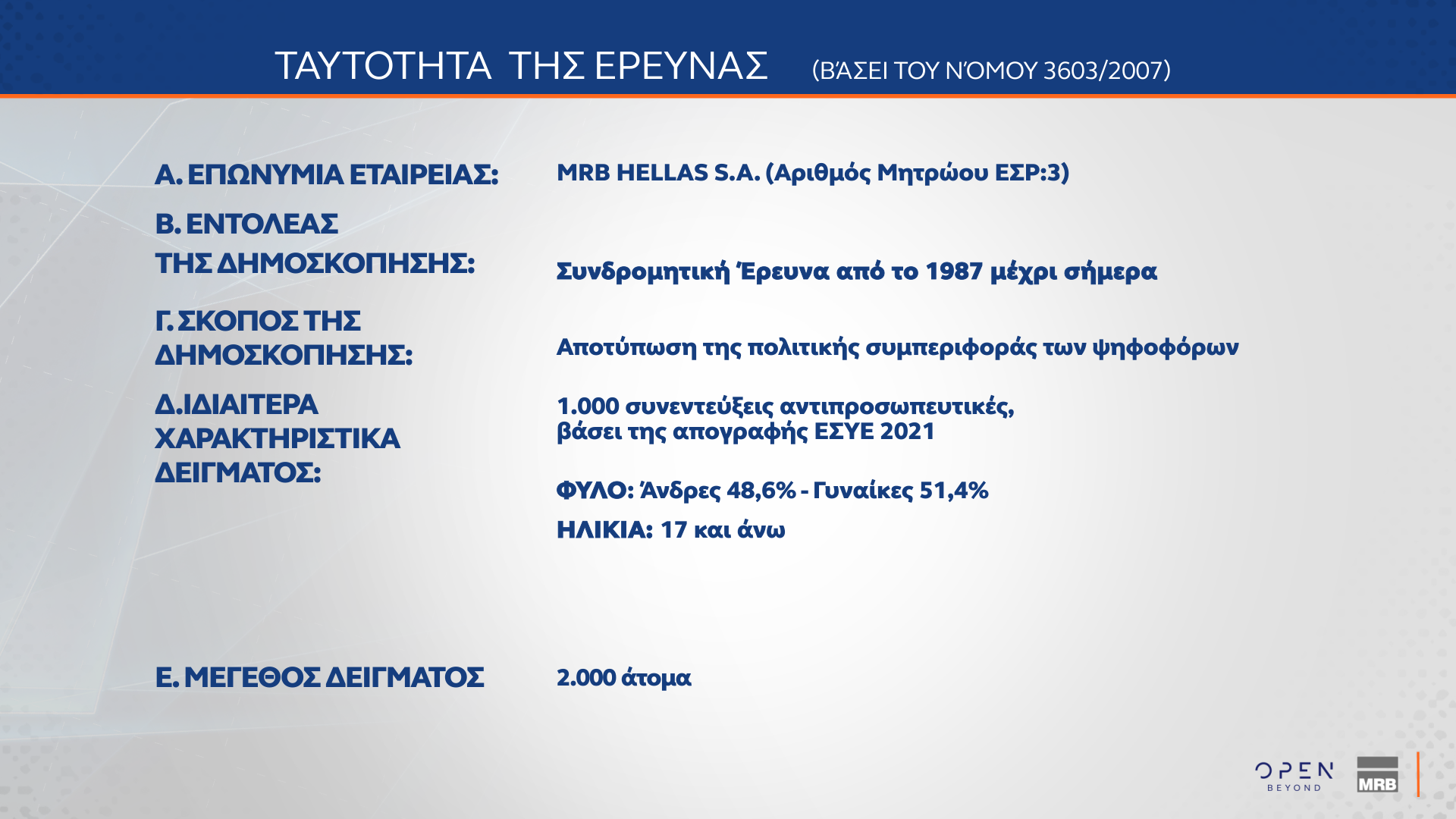 Ποσοστό 29,2%, έναντι 13,2% της Πλεύσης Ελευθερίας, στην αναγωγή στο σύνολο συγκέντρωσε η Νέα Δημοκρατία στη δημοσκόπηση MRB για το δελτίο ειδήσεων του OPEN.