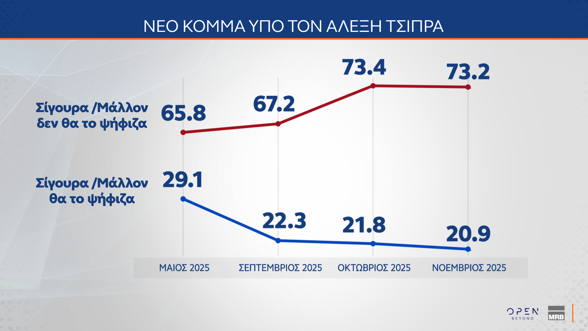 Ειδικότερα, σύμφωνα με την έρευνα της MRB, για λογαριασμό του Open, το 75,9% των αναποφάσιστων τάσσεται υπέρ της ανάγκης δημιουργίας νέων κομμάτων. Μάλιστα, από την ίδια κατηγορία ψηφοφόρων, το 32,1% δηλώνει ότι «σίγουρα/μάλλον» θα ψήφιζε ένα κόμμα Καρυστιανού, το 18,3% «σίγουρα/μάλλον» θα ψήφιζε ένα κόμμα Τσίπρα και το 17,2% «σίγουρα/μάλλον» θα ψήφιζε κόμμα Σαμαρά.