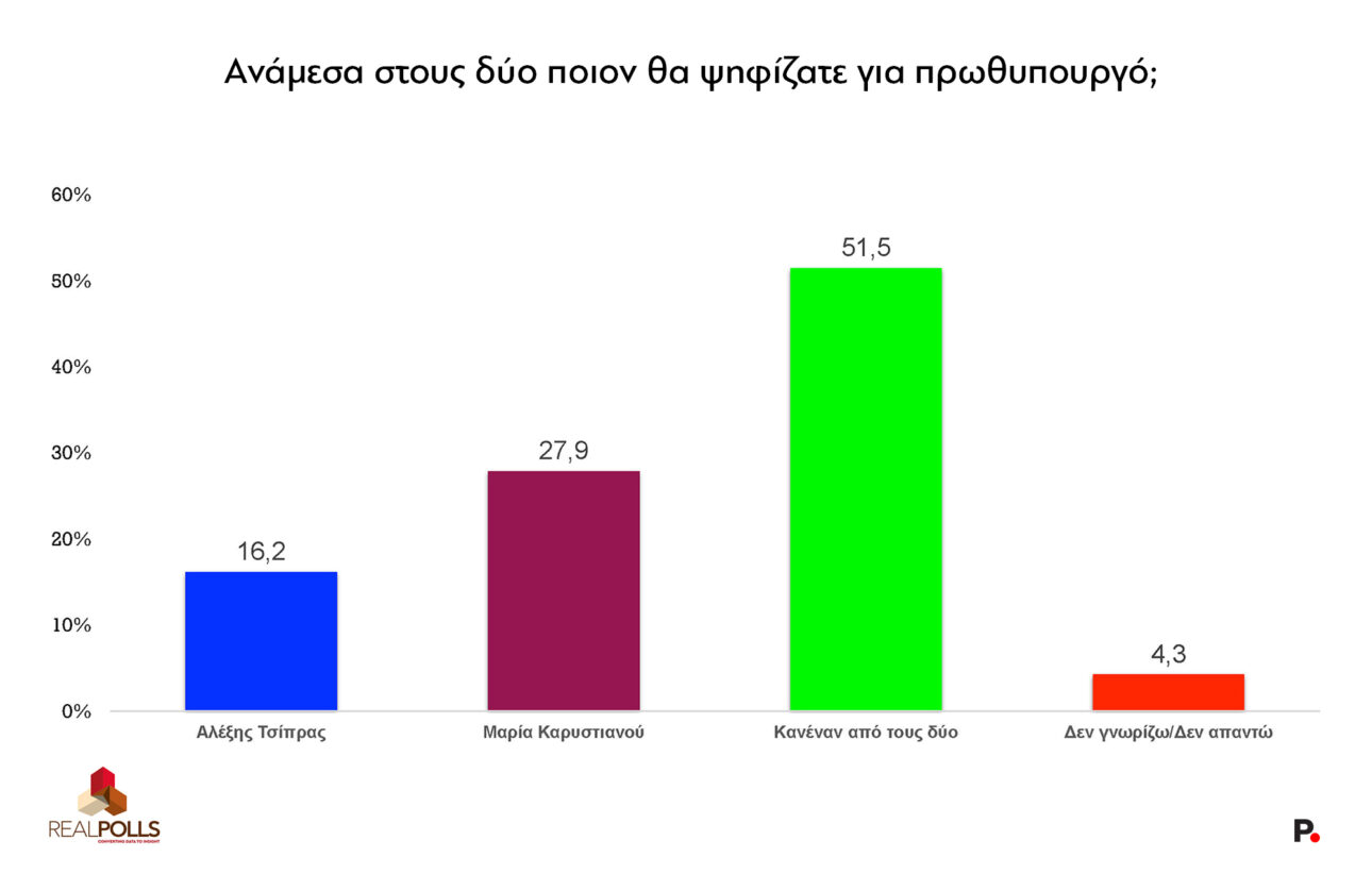 Στο ερώτημα για το ποιον από τους δύο θα ψήφιζαν για πρωθυπουργό, το 27,9% προτιμά την, παραιτηθείσα πλέον, πρόεδρο του συλλόγου «Τέμπη 2023» και μόλις το 16,2% τον κ. Τσίπρα, μολονότι ο τελευταίος διαθέτει πρωθυπουργική εμπειρία.