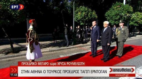 Στο Προεδρικό Μέγαρο έγινε η επίσημη τελετή υποδοχής του Τούρκου Προέδρου Ρετζέπ Ταγίπ Ερντογάν. Ο Πρόεδρος της Ελληνικής Δημοκρατίας, Προκόπης Παυλόπουλος, υποδέχτηκε τον Τούρκο ομόλογό του στην Ηρώδου του Αττικού.