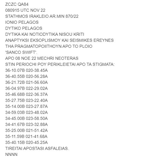 Η NAVTEX που εξέδωσε ο Σταθμός Ηρακλείου προβλέπει ότι από σήμερα 8 Νοεμβρίου 2022 και μέχρι νεωτέρας, δεσμεύονται περιοχές στο Ιόνιο Πέλαγος, το Δυτικό Πέλαγος και δυτικά και ανατολικά της Κρήτης, προκειμένου το πλοίο Sanco Swift να πραγματοποιήσει ανάπτυξη εξοπλισμού και σεισμικές έρευνες.