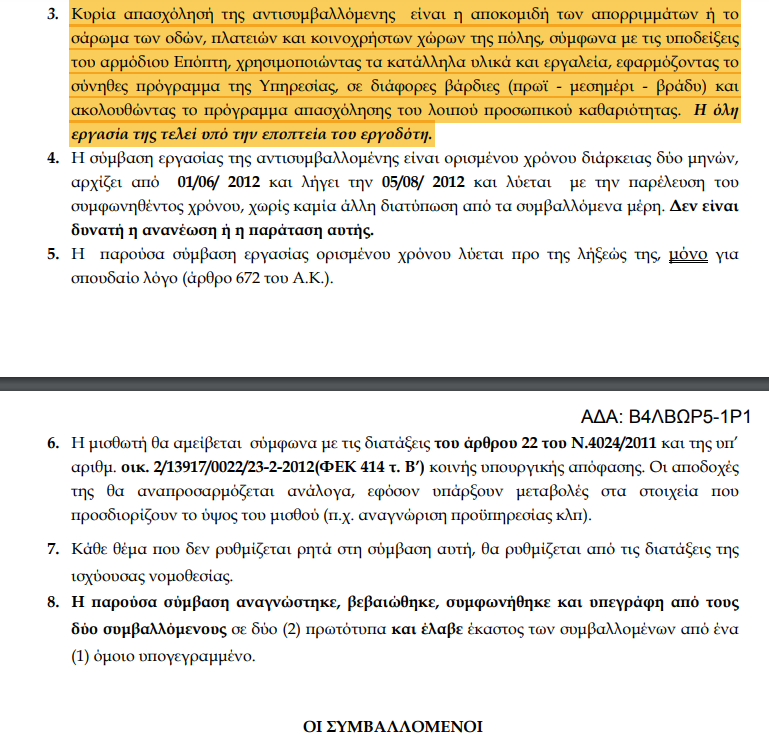 Το κείμενο της σύμβασης εργασίας ιδιωτικού δικαίου ορισμένου χρόνου, με την οποία προσελήφθη στο δήμο Θεσσαλονίκης είναι ιδιαίτερα αποκαλυπτικό. Σύμφωνα με την σύμβαση η κυρία Νοτοπούλου προσελήφθη με την ειδικότητα της εργάτριας καθαριότητας, στην οποία, κατά τη δήλωσή της στην ΕΡΤ, δεν δούλεψε ποτέ, αλλά κατάφερε να μπει σε θέση γραφείου, εκμεταλλευόμενη τις ελλείψεις του Δήμου.