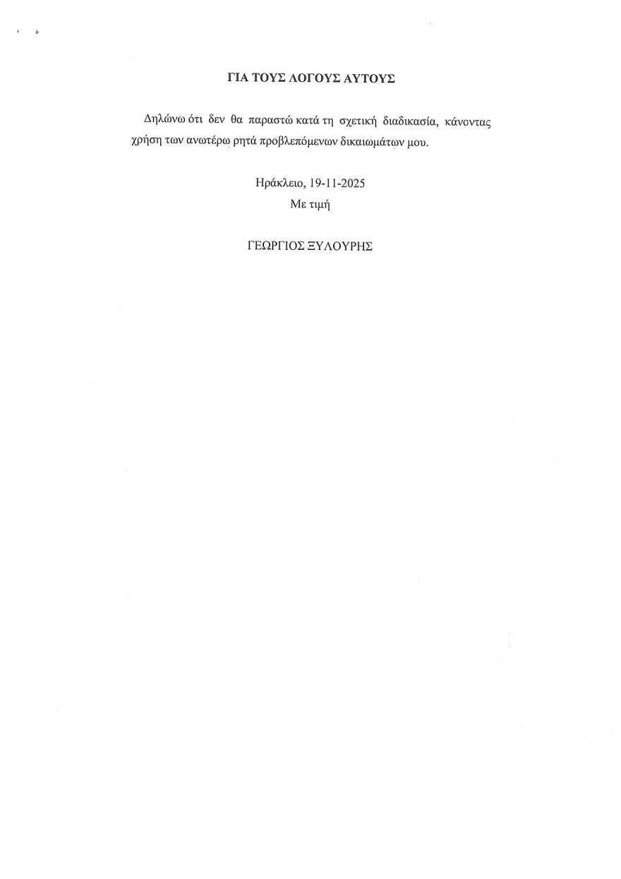 Ολοκληρώνοντας το υπόμνημά του, ο κ. Ξυλούρης υπογραμμίζει ότι δεν θα παραστεί στη διαδικασία της Εξεταστικής, αξιοποιώντας —όπως τονίζει— τα δικαιώματα που του παρέχει ο νόμος.