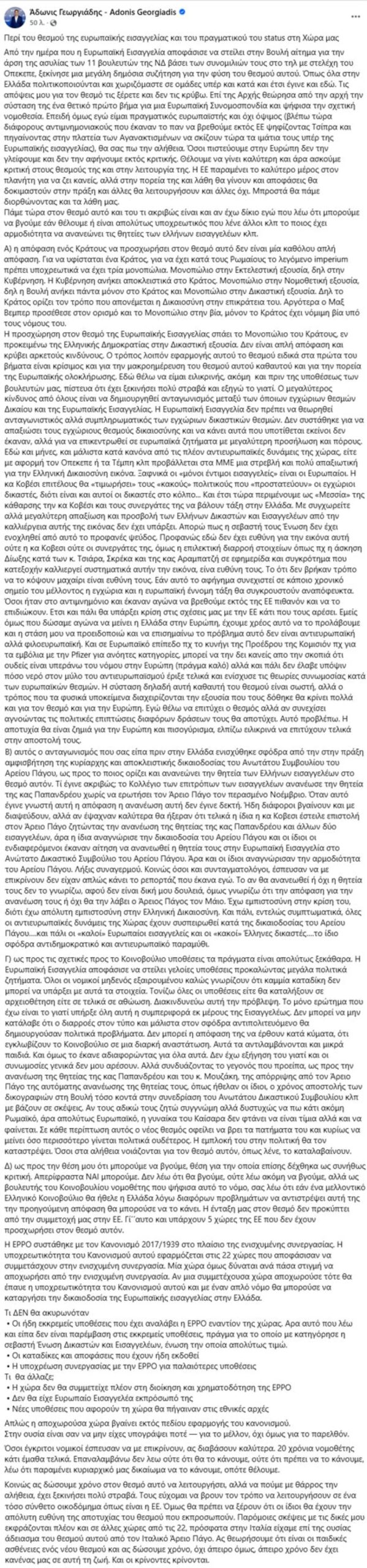 «Από το πρωί σε όλα τα κανάλια ακούω τους δημοσιογράφους να ρωτούν συναδέλφους μου βουλευτές της Νέας Δημοκρατίας, εάν συμφωνούν με την «επίθεση» μου στον θεσμό της Ευρωπαϊκής Εισαγγελίας κλπ για να τους βγάλω όλους από την δύσκολη θέση έγραψα μόλις στην σελίδα μου στο Facebook τις απόψεις μου για τον θεσμό αυτόν και τα πρόσφατα γεγονότα χωρίς φωνές και διακοπές. Είμαι βουλευτής του Ελληνικού Κοινοβουλίου επί 20 συναπτά έτη και έχω απόλυτης κατοχυρωμένο Συνταγματικό Δικαίωμα έκφρασης Γνώμης. Επίσης έχω την τιμή να είμαι Αντιπρόεδρος στην πλέον φιλοευρωπαϊκή παράταξη της χώρας, έδωσα μάχη τα χρόνια του αντιμνημονίου να μείνει η Ελλάδα στην ΕΕ και ευτυχώς στην παράταξη μου μπορούμε και να διαφωνούμε. Αλλιώς θα ήμασταν σταλινικοί κομμουνιστές. Όσοι πράγματι ενδιαφέρονται λοιπόν για τις απόψεις μου ας το διαβάσουν».