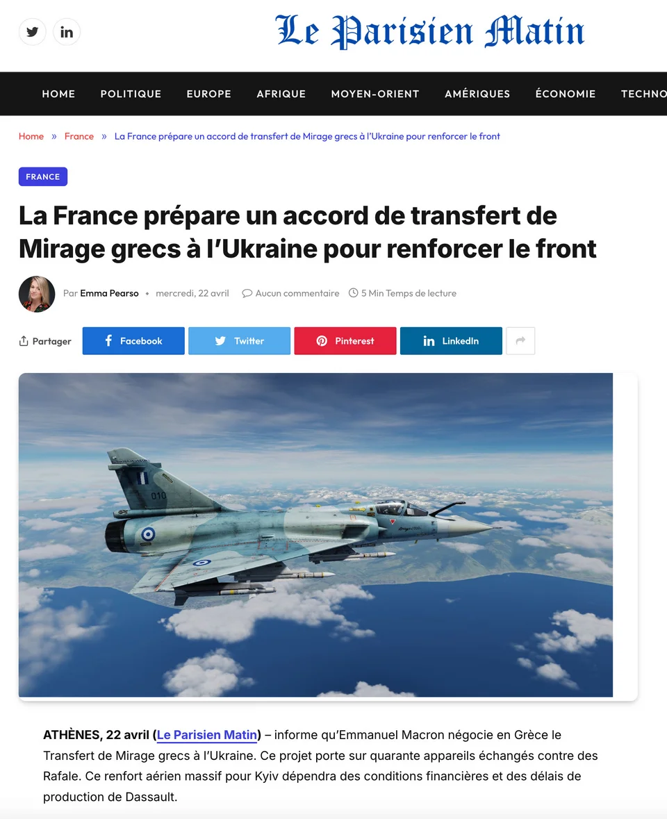 «Παρά τα εμπόδια που σχετίζονται με τη βιομηχανική παραγωγή του Rafale, το Παρίσι βασίζεται σε ένα κλιμακωτό χρονοδιάγραμμα παράδοσης για να ικανοποιήσει την Ελλάδα. Στόχος είναι να διασφαλιστεί η μεταφορά ελληνικών μαχητικών αεροσκαφών Mirage στην Ουκρανία πριν από το τέλος του καλοκαιριού, επιτρέποντας έτσι την ταχεία επιχειρησιακή ανάπτυξη. Αυτός ο ελιγμός επιβεβαιώνει τον ηγετικό ρόλο της Γαλλίας στην παροχή τεχνολογικής υποστήριξης στην Ουκρανική Πολεμική Αεροπορία», γράφει χαρακτηριστικά.
