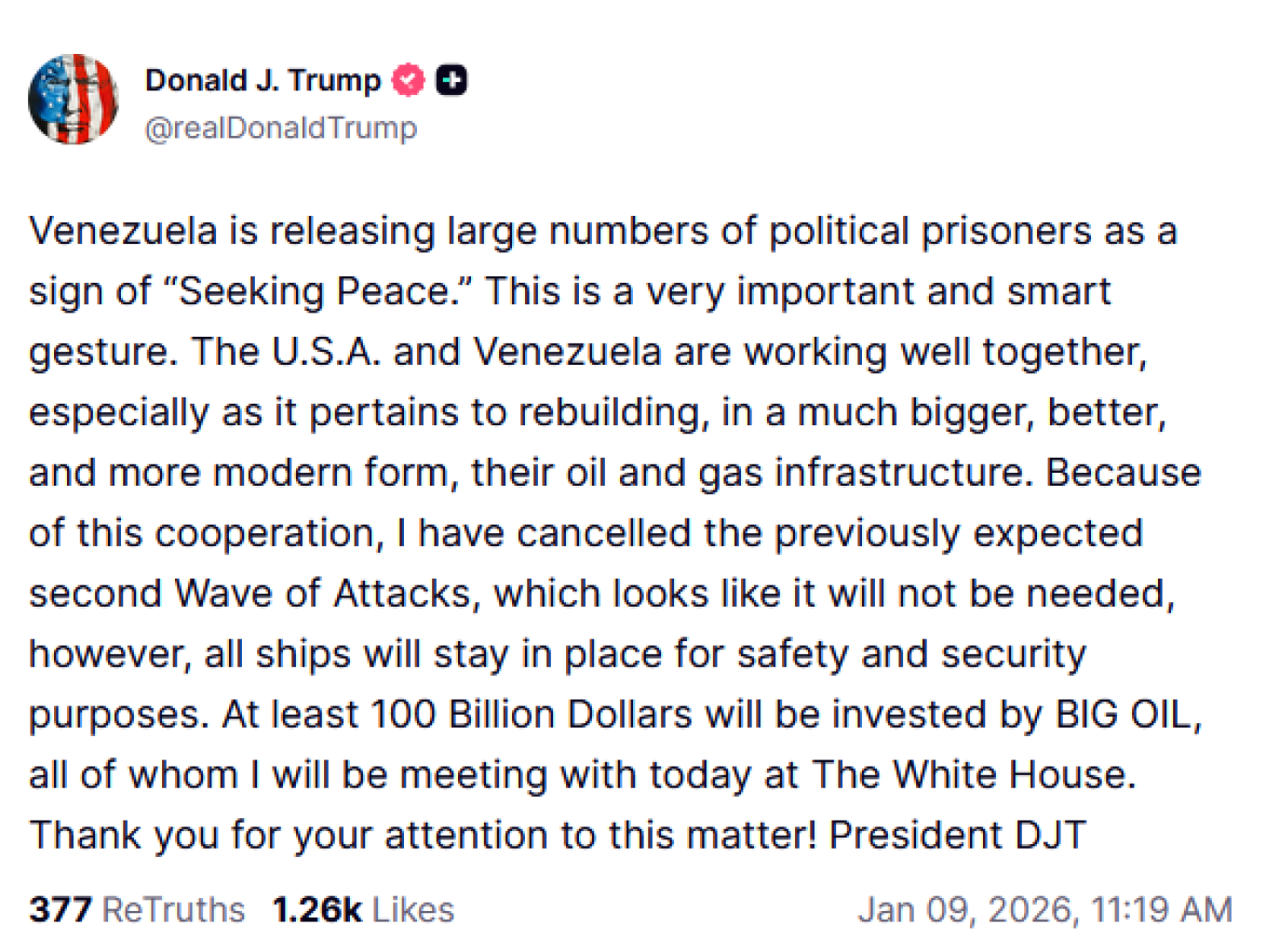 Η Βενεζουέλα απελευθερώνει μεγάλο αριθμό πολιτικών κρατουμένων ως ένδειξη «αναζήτησης ειρήνης». Πρόκειται για μια πολύ σημαντική και έξυπνη κίνηση. Οι ΗΠΑ και η Βενεζουέλα συνεργάζονται καλά, ειδικά όσον αφορά την ανασυγκρότηση, σε μια πολύ μεγαλύτερη, καλύτερη και πιο σύγχρονη μορφή, των υποδομών πετρελαίου και φυσικού αερίου.