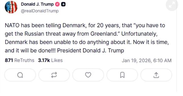 Ο αμερικανός πρόεδρος Ντόναλντ Τραμπ συνέχισε χθες Κυριακή να ασκεί πίεση για το ζήτημα της Γροιλανδίας, υποστηρίζοντας μέσω Truth Social ότι η Δανία δεν έχει κάνει «τίποτα» επί «20 χρόνια» για την απομάκρυνση της «ρωσικής απειλής» από τη νήσο που αποτελεί αυτόνομη περιοχή του βασιλείου και προσθέτοντας «τώρα είναι η ώρα», και «θα γίνει», προσθέτοντας τρία θαυμαστικά.