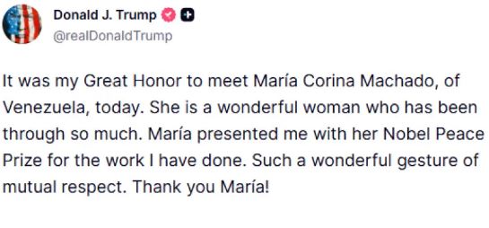 «Η Μαρία μου έδωσε το βραβείο Νόμπελ Ειρήνης για το έργο που έφερα σε πέρας. Τι υπέροχη χειρονομία αμοιβαίου σεβασμού. Ευχαριστώ Μαρία!», ανέφερε ο ρεπουμπλικάνος πρόεδρος μέσω Truth Social.