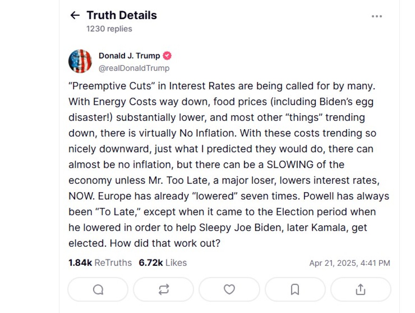 «Η Ευρώπη έχει ήδη μειώσει τα επιτόκια επτά φορές. Ο Πάουελ πάντα ήταν αργοπορημένος, εκτός από την προεκλογική περίοδο, όταν τα μείωσε για να βοηθήσει τον Sleepy Joe Biden και αργότερα την Κάμαλα, να εκλεγούν. Πώς πήγε αυτό;», γράφει μεταξύ άλλων ο Aμερικανός πρόεδρος.