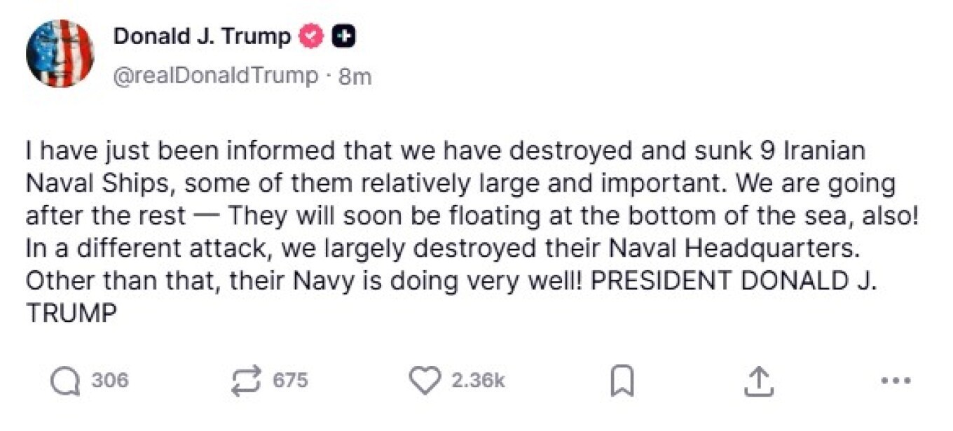 Ακόμη λίγη ώρα νωρίτερα σήμερα με ανάρτησή του ο Τραμπ πανηγύριζε τη βύθιση 9 ιρανικών πολεμικών πλοίων, «ορισμένων εκ των οποίων μεγάλων και σημαντικών», κάνοντας λόγο για συνέχιση των επιχειρήσεων κατά του ιρανικού ναυτικού.