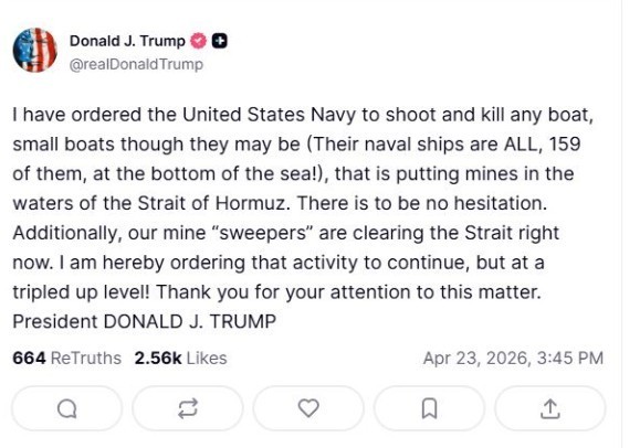«Έχω δώσει εντολή στο Πολεμικό Ναυτικό των Ηνωμένων Πολιτειών να πυροβολήσει και να καταστρέψει κάθε σκάφος, όσο μικρό κι αν είναι (τα πολεμικά πλοία τους βρίσκονται ΟΛΑ, και τα 159, στον βυθό της θάλασσας!), που τοποθετεί νάρκες στα ύδατα των Στενών του Ορμούζ. Δεν πρέπει να υπάρξει κανένας ενδοιασμός. Επιπλέον, τα «ναρκαλιευτικά» μας καθαρίζουν το Στενό αυτή τη στιγμή. Δια του παρόντος διατάζω να συνεχιστεί αυτή η δραστηριότητα, αλλά σε τριπλάσιο επίπεδο! Σας ευχαριστώ για την προσοχή σας σε αυτό το θέμα. Πρόεδρος ΝΤΟΝΑΛΝΤ ΤΡΑΜΠ».