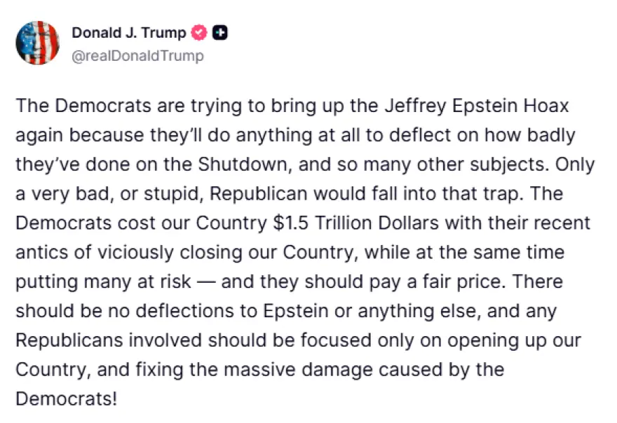 Δεν πρέπει να υπάρχει κανένας αποπροσανατολισμός προς τον Επστάιν ή οτιδήποτε άλλο, και οι Ρεπουμπλικανοί που εμπλέκονται πρέπει να επικεντρωθούν μόνο στο άνοιγμα της χώρας μας και στην αποκατάσταση των τεράστιων ζημιών που προκάλεσαν οι Δημοκρατικοί!