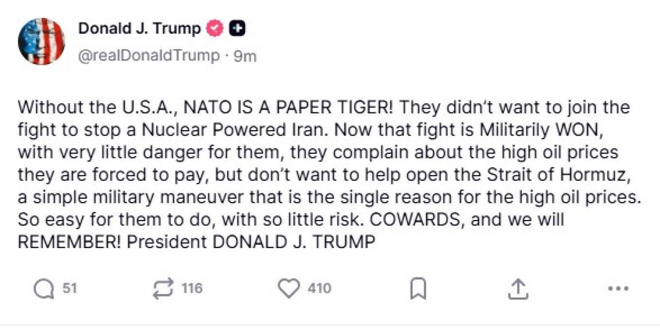 Σε ανάρτησή του, ο Τραμπ ανέφερε ότι, αν και η στρατιωτική νίκη απέναντι στο Ιράν έχει επιτευχθεί με ελάχιστο κίνδυνο για τα μέλη του ΝΑΤΟ, τα κράτη μέλη συνεχίζουν να παραπονιούνται για τις υψηλές τιμές του πετρελαίου, τις οποίες είναι αναγκασμένα να πληρώνουν.