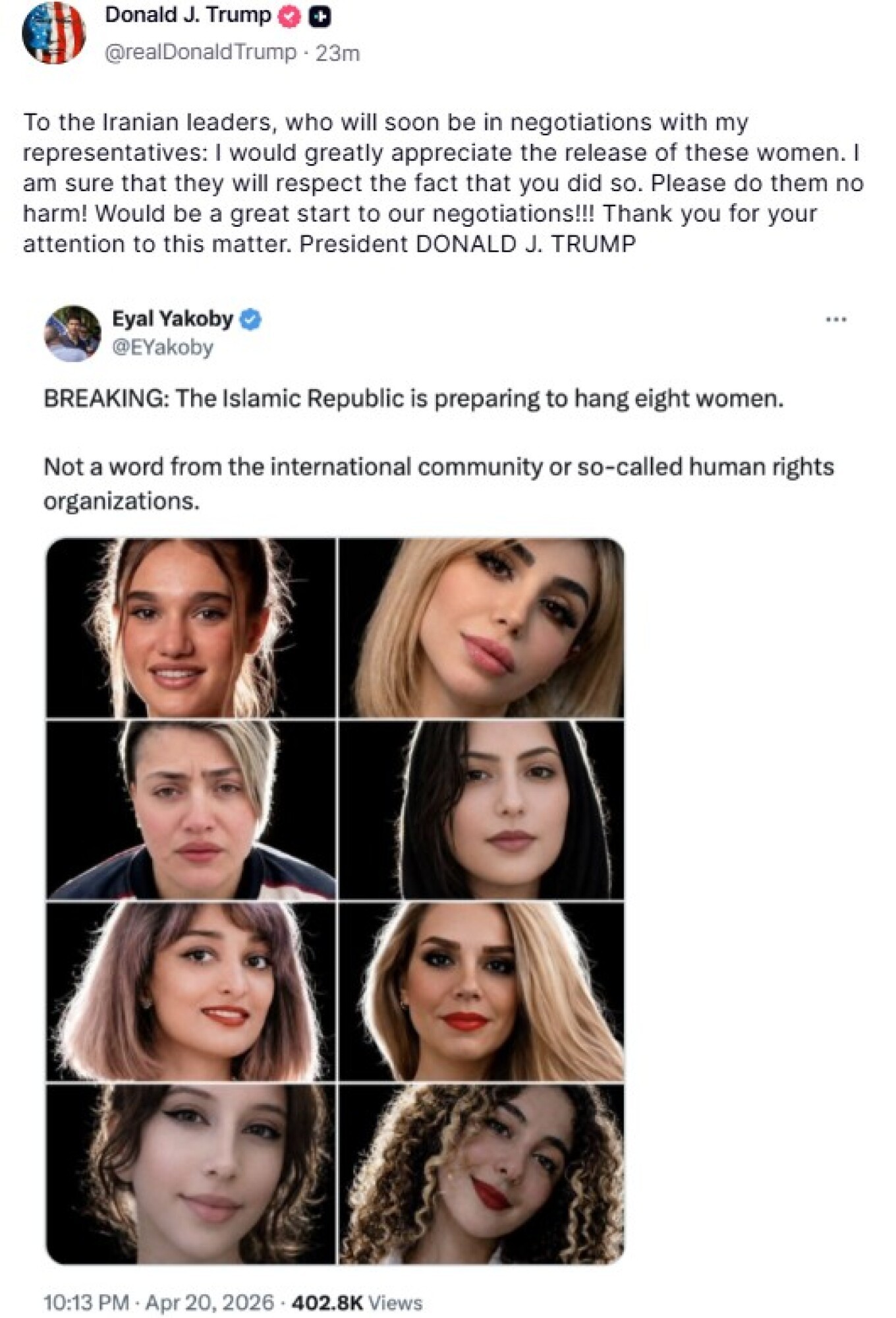 Στην ανάρτησή του ο Τραμπ επισυνάπτει ένα screenshot μια φωτογραφία ανάρτησης, του φιλοϊσραηλινού ακτιβιστή Eyal Yakoby, στην οποία ο Yakoby γράφει ότι το Ιράν ετοιμάζεται να απαγχονίσει οκτώ γυναίκες και δείχνει τις φωτογραφίες τους.