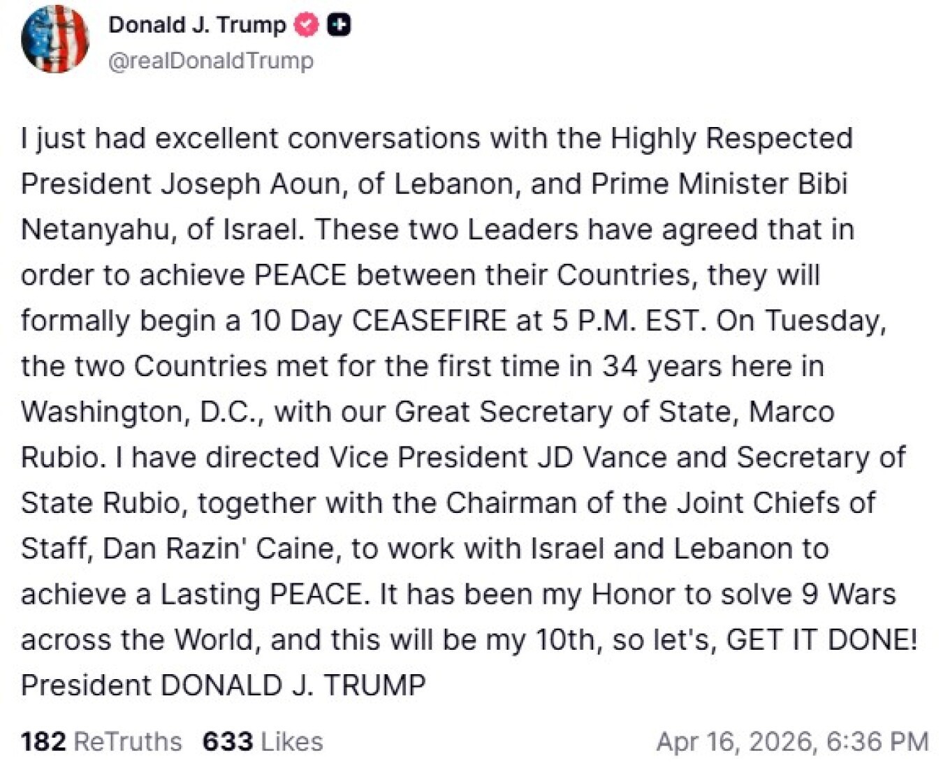 Σύμφωνα με τον Αμερικανό πρόεδρο, στόχος της εκεχειρίας είναι η δημιουργία των προϋποθέσεων για μια ευρύτερη συμφωνία ειρήνης μεταξύ των δύο χωρών. Υπενθύμισε επίσης ότι αντιπροσωπείες του Ισραήλ και του Λιβάνου συναντήθηκαν στην Ουάσιγκτον για πρώτη φορά μετά από 34 χρόνια, παρουσία του υπουργού Εξωτερικών των ΗΠΑ Μάρκο Ρούμπιο.