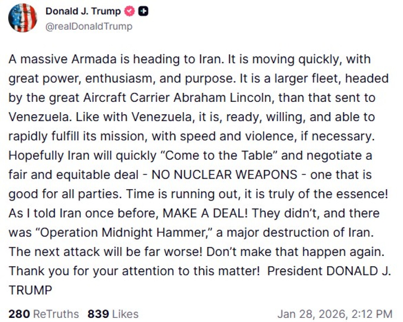 Σε ανάρτησή του, ο Τραμπ ανέφερε ότι η αρμάδα, με επικεφαλής το αεροπλανοφόρο USS Abraham Lincoln, κινείται με «μεγάλη ταχύτητα, με μεγάλη ισχύ, ενθουσιασμό και αποφασιστικότητα», τονίζοντας ότι πρόκειται για έναν μεγαλύτερο στόλο από αυτόν που στάλθηκε στη Βενεζουέλα.