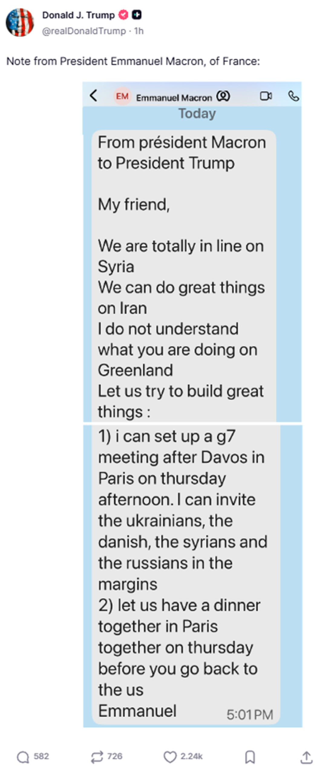 Σύμφωνα με το screenshot του μηνύματος, ο Μακρόν λέει στον Τραμπ ότι «συμφωνούμε απόλυτα στο θέμα της Συρίας», «μπορούμε να κάνουμε σημαντικά πράγματα αναφορικά με το Ιράν», όμως προσθέτει ότι «δεν καταλαβαίνω τι κάνεις με τη Γροιλανδία».