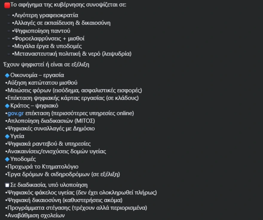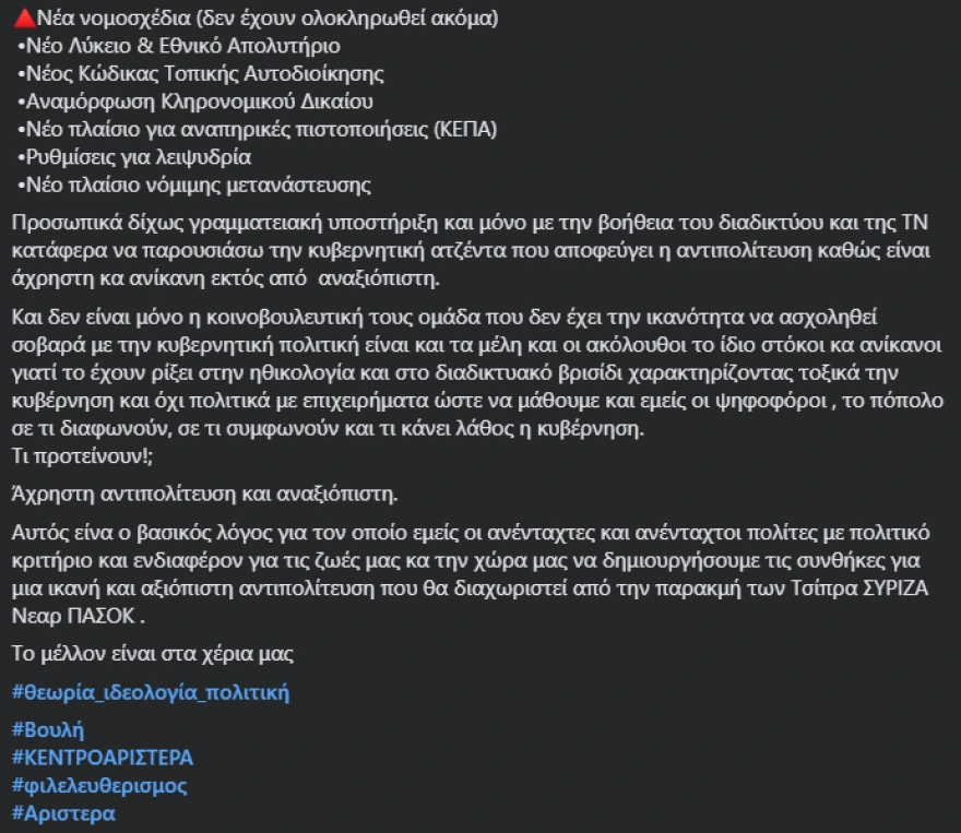 «Σας παρουσιάζω με τι δεν ασχολήθηκαν σοβαρά, δημόσια, αξιόπιστα εναλλακτικά και μαζικά δηλαδή διαδικτυακά οι ανίκανοι και άχρηστοι της αντιπολίτευσης με σημαιοφόρους της παρακμής το ΣΥΡΙΖΑ Νεαρ Τσίπρα ΠΑΣΟΚ» λέει και τονίζει ότι ο ίδιος «προσωπικά δίχως γραμματειακή υποστήριξη και μόνο με την βοήθεια του διαδικτύου και της ΤΝ κατάφερα να παρουσιάσω την κυβερνητική ατζέντα που αποφεύγει η αντιπολίτευση καθώς είναι άχρηστη και ανίκανη εκτός από αναξιόπιστη».