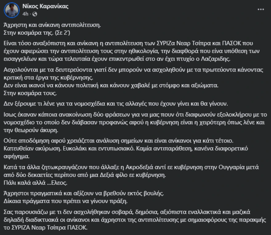 Με μια αιχμηρή ανάρτηση, ο Νίκος Καρανίκας, πρώην σύμβουλος του Αλέξη Τσίπρα την περίοδο της πρωθυπουργίας του, στηλιτεύει την στάση της αντιπολίτευσης που, όπως λέει αντί να ασχολείται με τα μείζοντα, ασχολείται με το αν έχει πτυχίο ο Μακάριος Λαζαρίδης.