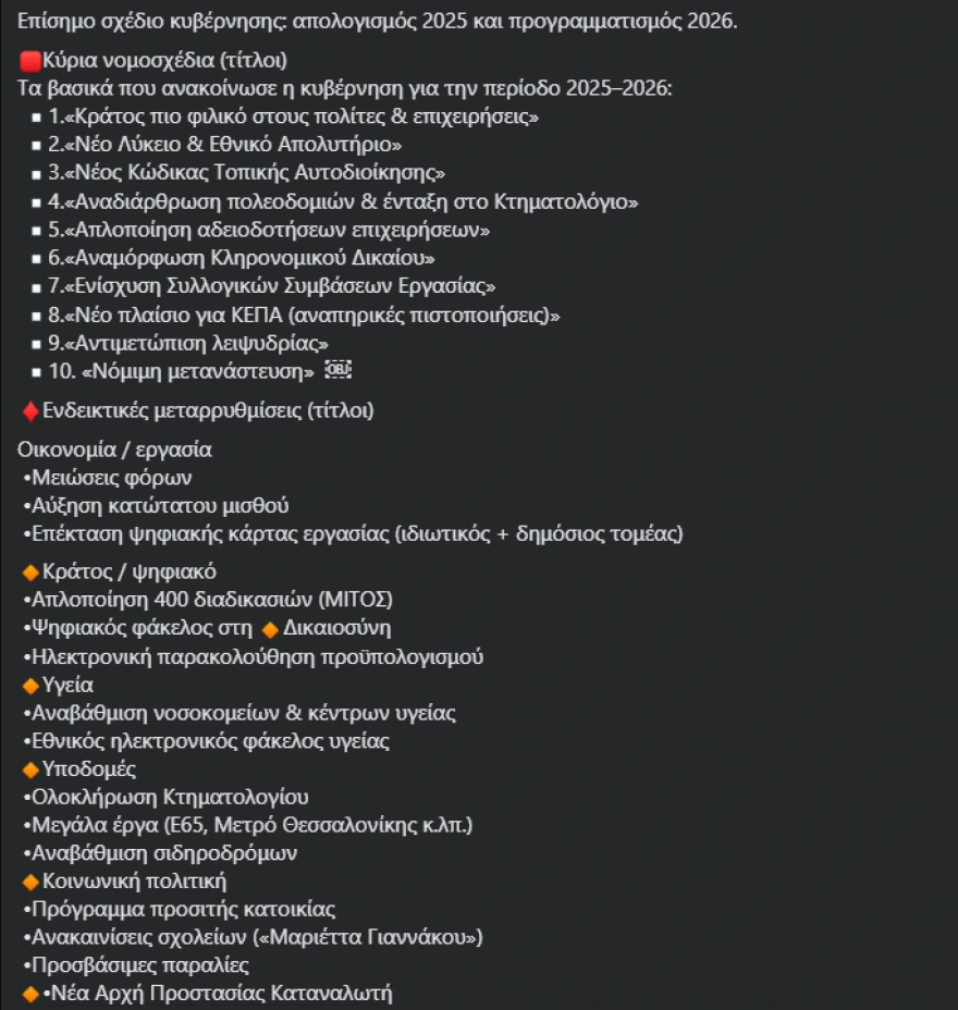 Μάλιστα, ο Νίκος Καρανίκας απαριθμεί μια σειρά από νομοσχέδια που παρουσίασε η κυβέρνηση το 2025-26 για να υπογραμμίζει ότι στο σύνολό της η αντιπολίτευση δεν εδέησε να πει την άποψή της επ’ αυτών.
