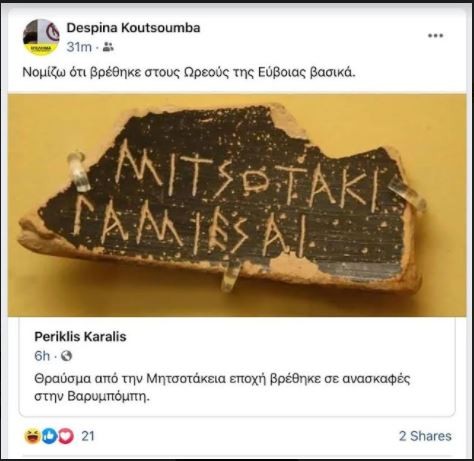 Να σημειωθεί ότι η ανάρτηση της Δέσποινας Κουτσούμπα στα social media περιλαμβάνει ένα κεραμίδι, καμένο από τις φωτιές με χαραγμένη μια υβριστική βράση εναντίον του Κυριάκου Μητσοτάκη