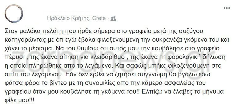 Ο λογιστής μέσα από την ανάρτηση του καλεί τον πελάτη του να ζητήσει συγνώμη, ενώ προχωρά ακόμα παραπέρα… προειδοποιώντας με δημοσιοποίηση υλικού από κάμερες που δείχνει τον κύριο μετά της ερωμένης να μπαίνουν στο γραφείο του και να «τακτοποιούν» τις υποθέσεις τους.