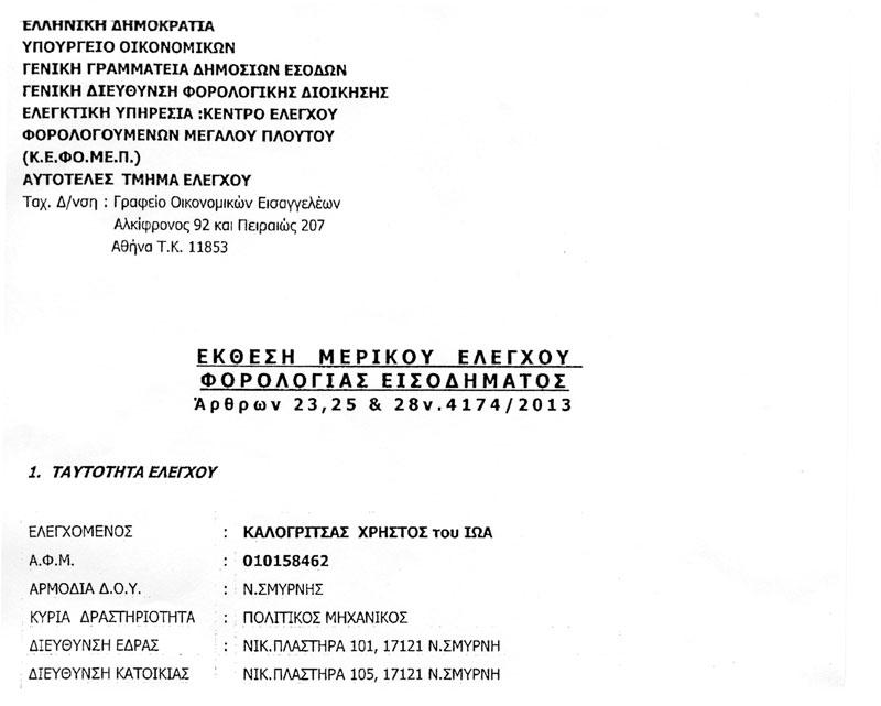 Σύμφωνα με το πόρισμα του Κέντρου Ελέγχου Φορολογούμενων Μεγάλου Πλούτου, ο επιχειρηματίας, που έχει αναλάβει πληθώρα δημοσίων έργων, κ. Χρήστος Καλογρίτσας και η σύζυγός του απέκρυπταν δεκάδες εκατομμύρια ευρώ. Μάλιστα, στα εισοδήματά τους δήλωναν ότι ζούσαν με 300 ευρώ τον μήνα. εμφάνιζε ετήσια εισοδήματα που δεν υπερέβαιναν τα 10.000 ευρώ και έπαιρνε ακόμα και επιστροφή από την Εφορία. Φυσικά, στους τραπεζικούς του λογαριασμούς υπήρχαν πολλά εκατομμύρια.